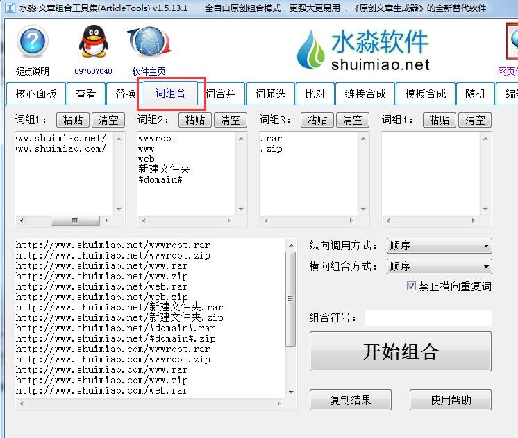 使用文章组合工具集的词组合工具将采集好的域名+需要扫描的文件名+需要扫描的后缀(如zip、rar等)进行全部可能性组合生成最终网址。